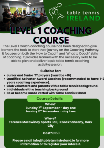 Munster TT will be hosting a Level 1 coaching course in 2025 in Knocknaheeny, Cork City later this year. Any one interested should apply to TTI asap – details as per attached fliers.